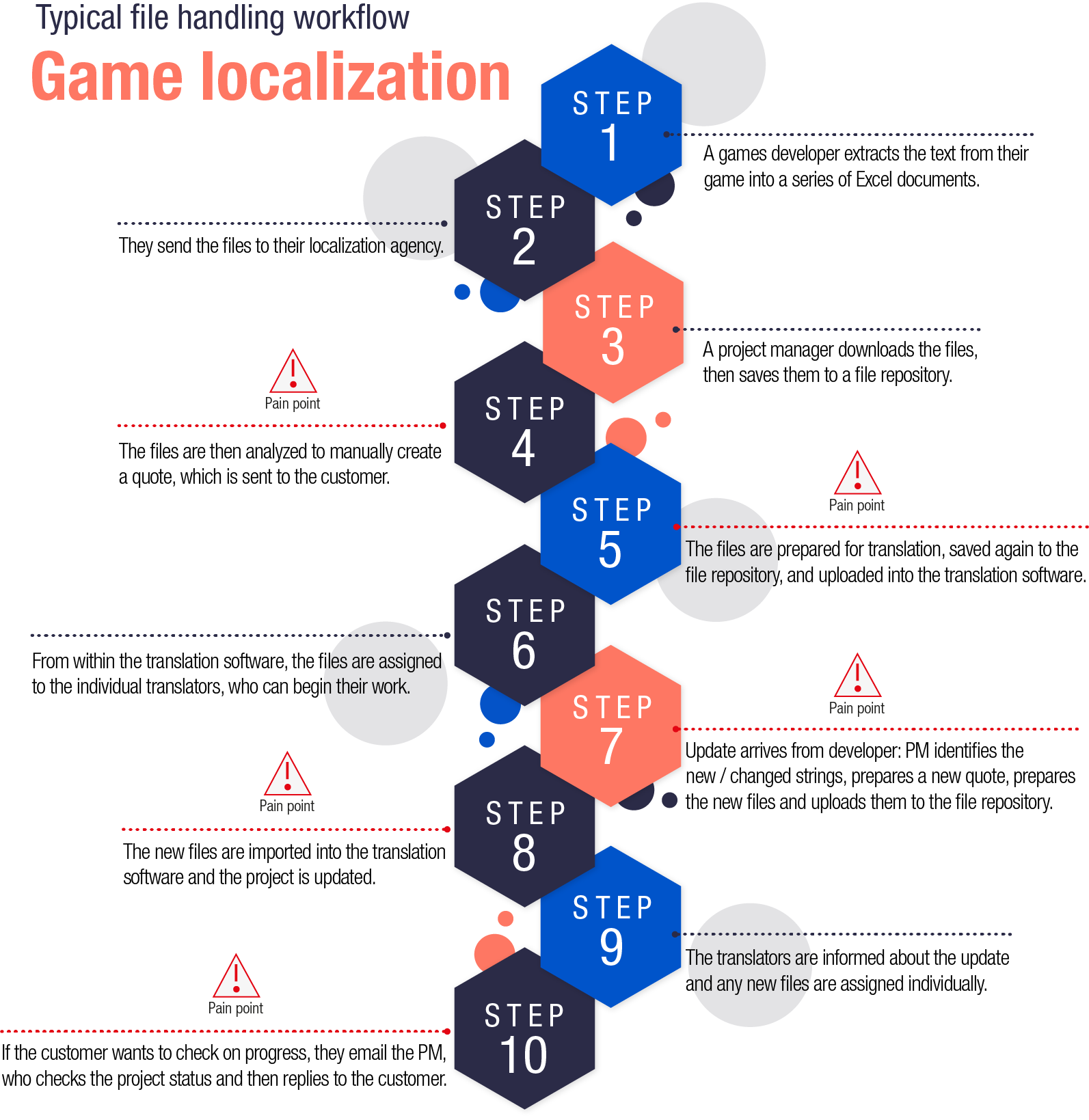A typical file-handling workflow for a video game localization project has a lot of manual touchpoints. From the moment the files arrive at the game translation agency, they will be saved, uploaded to a file repository, analyzed, prepared for translation… and the work continues as the project is created in the translation software and assigned to the individual translators. If the client needs to update a file or add files to the project, many of those steps will be repeated.